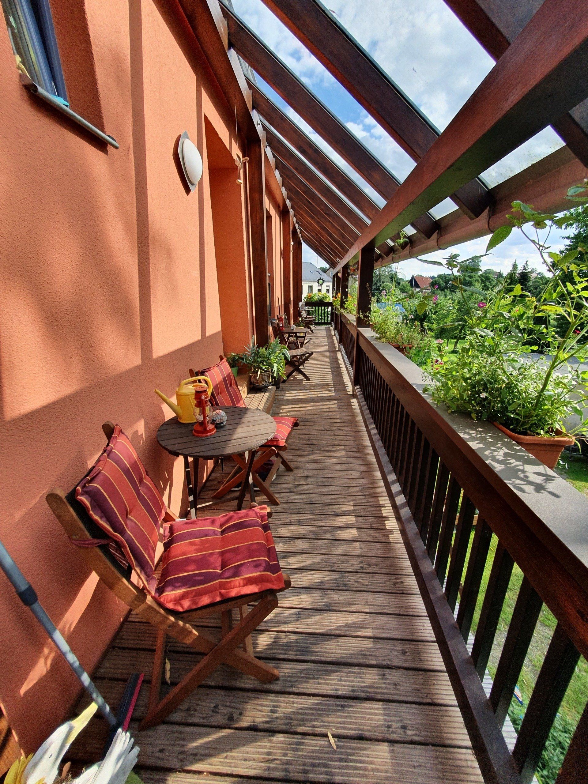 Die Wohnungen erreichen Sie über einen mit Glas überdachten Laubengang, der auch zur Erholung von Ihren Wander- und Klettertouren oder zum Entspannen in den Abendstunden dienen soll.